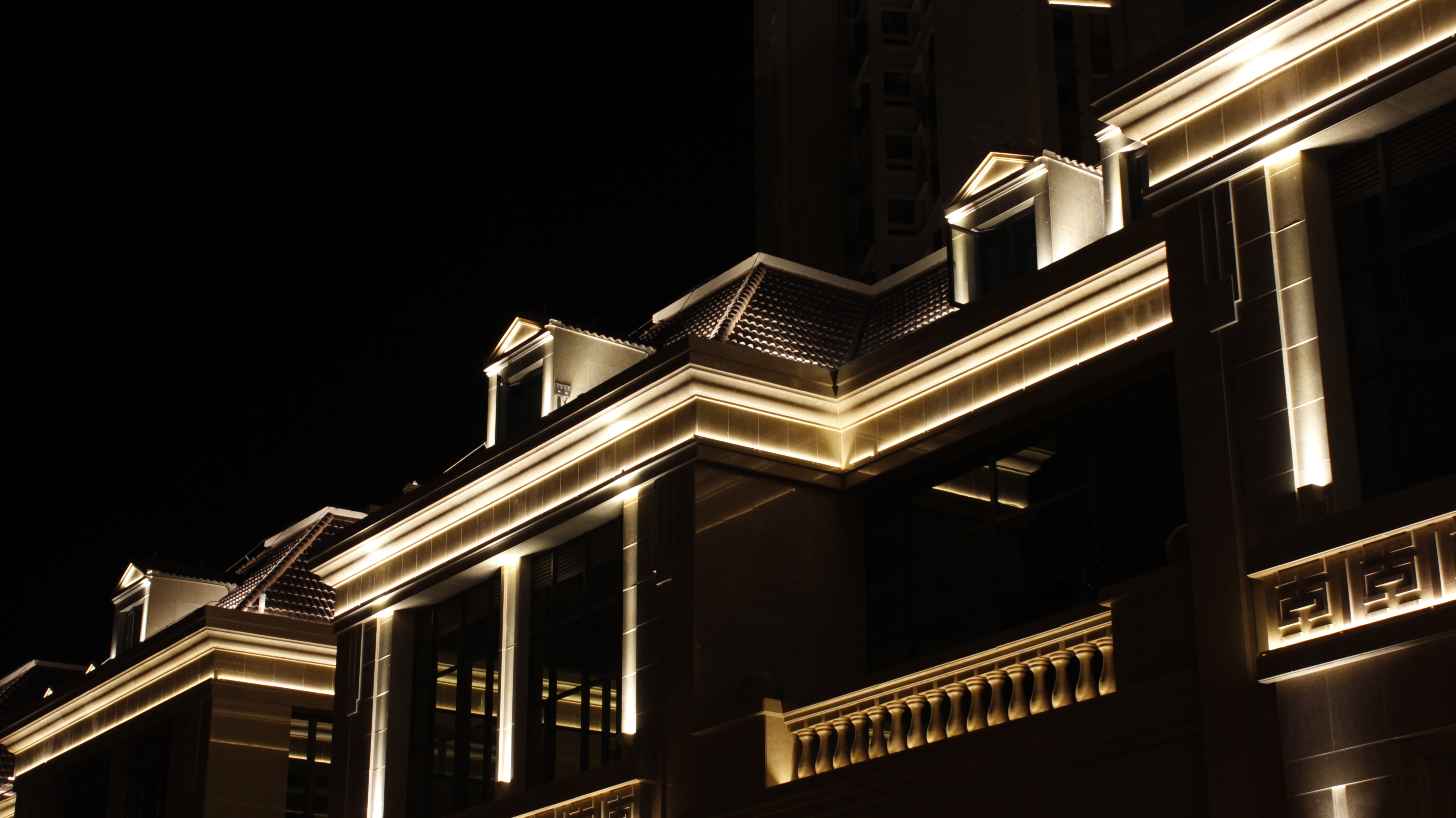 一般將洗墻燈安裝于建筑的頂部,腰線等位置的一種照明手法。