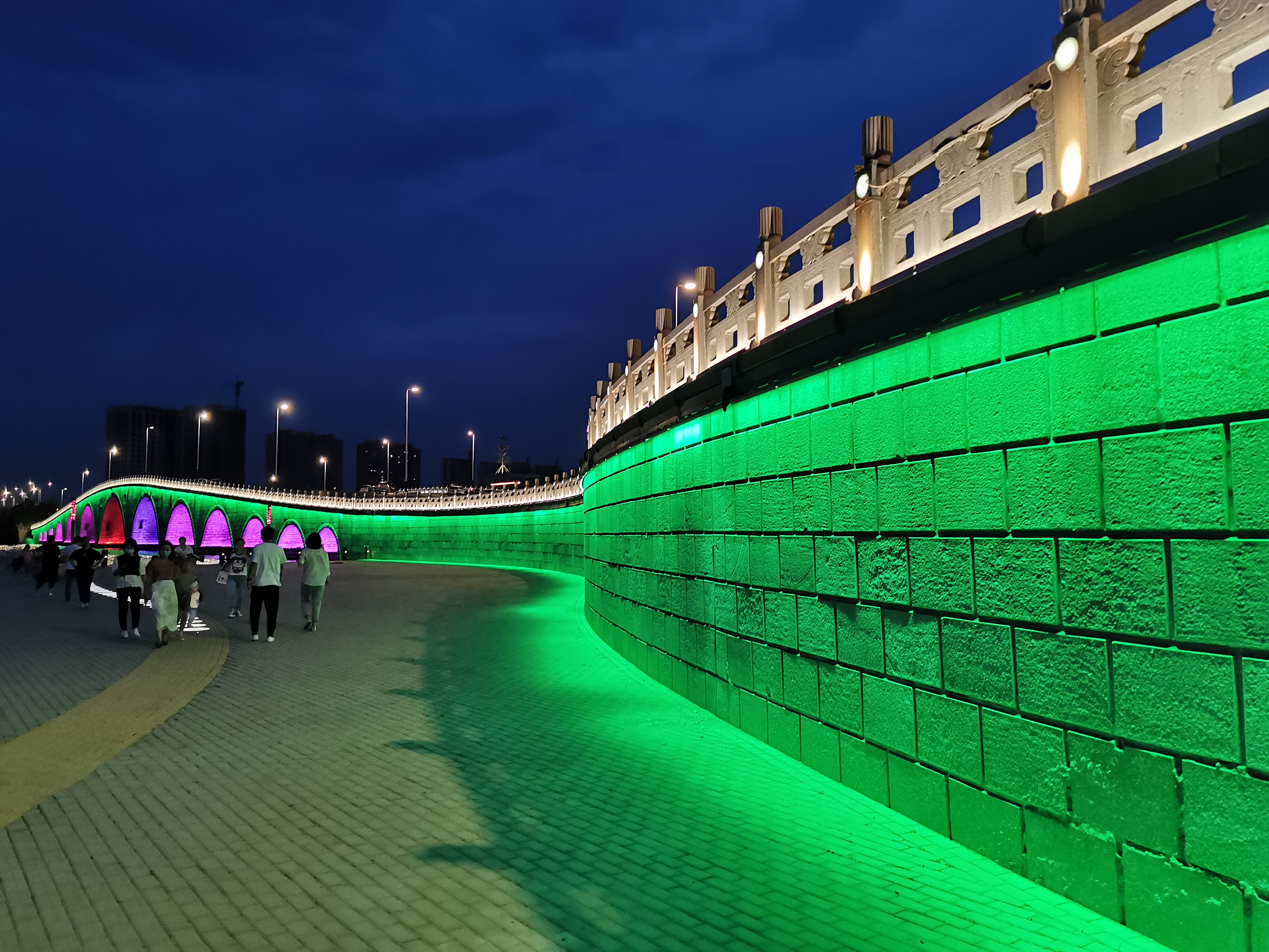 通常將洗墻燈安裝于沿河堤岸或護坡上部,通過從上往下的一種打光形式將被照面打亮的一種裝燈方式。